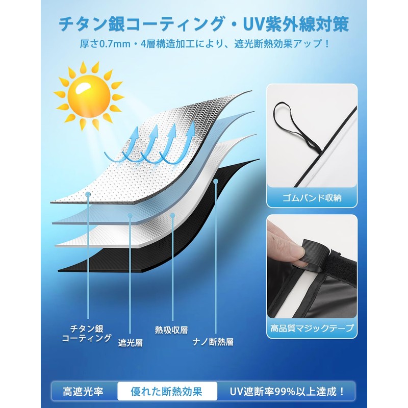 - 2. Improved Version with 4 Layer High Density Fabric: This product has a reflective aluminum foil layer and extra thick high-density non-woven fabric that effectively blocks 99.9% of UV rays.The 4-layer construction provides a high insulation effect that reflects strong sunlight in the summer to reduce the temperature inside your car and protect your car from UV rays to create a comfortable interior space.With its special insulating and UV reduction material, this sunshade boasts overwhelming quality that is great for both summer and winter seasons.Excellent thermal insulated blackout shade!
