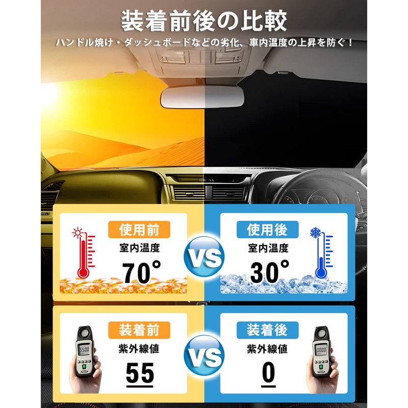 - ✔3. UV Protection, Heat Insulation, Prevents Interior Degradation: 1. Effectively blocks 99% of harmful UV rays, protecting your precious car from sun damage, burned steering wheels, dashboards and other resin parts and extending the life of the car.2. Adopts 4-layer insulation to reduce the temperature inside the car, reducing the load on the air conditioner and improving fuel economy.Super recommended sunshade that prevents interior deterioration and prevents the interior temperature from rising.