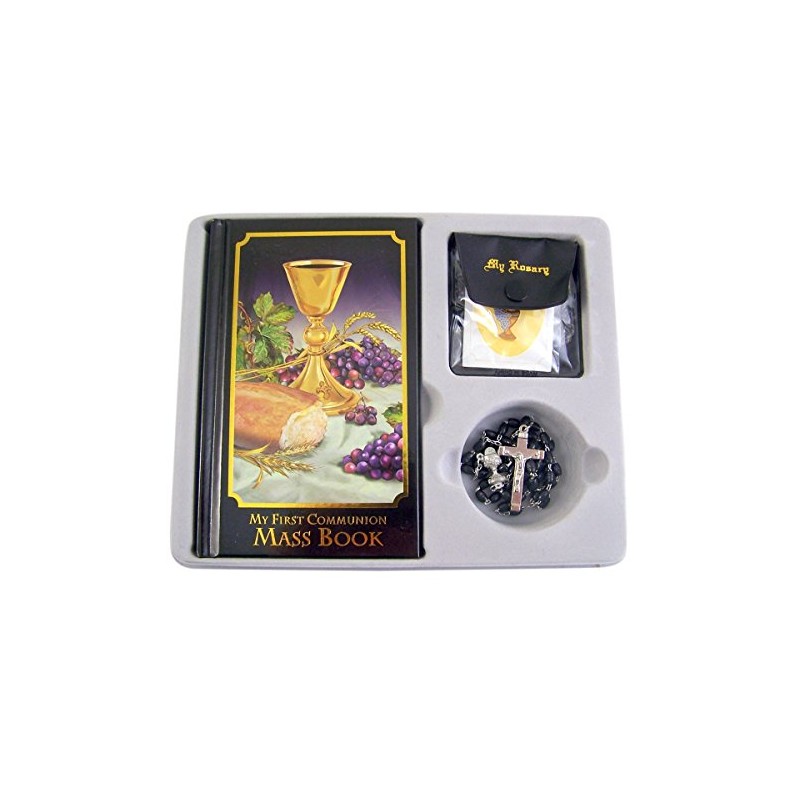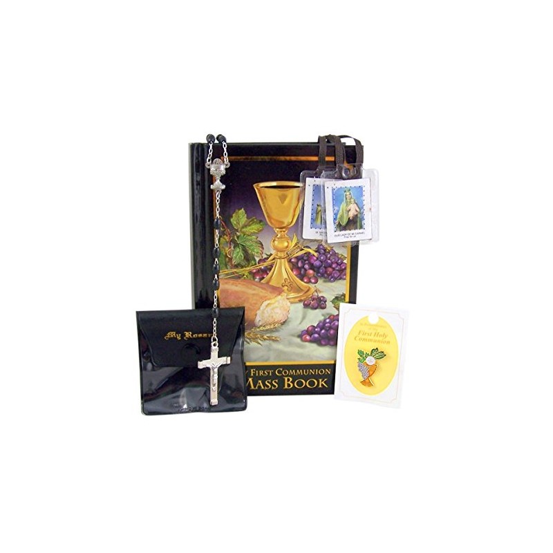 - Set includes mass book, rosary with case, lapel pin and scapular