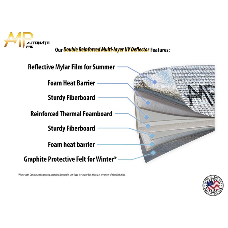 • The incredibly reflective mylar side reduces heat buildup in your vehicle by as much as 40 degrees Fahrenheit. Alternatively, use the graphite felt side to keep your vehicle defrosted in colder seasons. Please note that if your windshield sensor is not centered, the reversal of sunshades will not work.