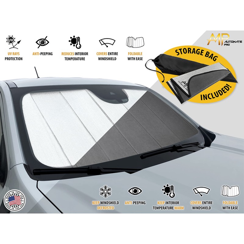AutoMate Pro's high-tech reversible folding sunshade is customized to fit each specific vehicle model, ensuring edge-to-edge coverage and protection. This helps prevent discoloration and cracking from direct UV exposure. Not only will your vehicle's temperature and appearance be more enjoyable, but you can also experience true privacy by shielding its contents from both UV light and unwanted attention. Folding and unfolding our sunshades takes only seconds, and the convenient storage bag that accompanies every sunshade makes it even easier to extend your vehicle's lifetime.