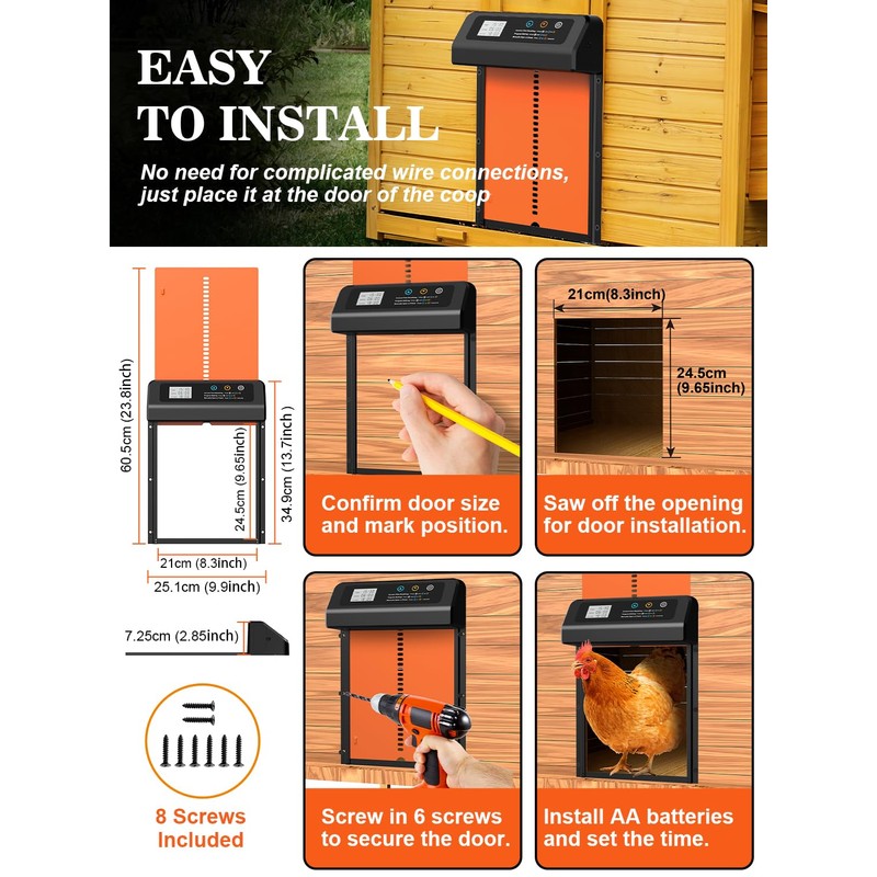 Automatic Chicken Coop Door, Aluminum Automatic Chicken Door with Anti-Pinch Feature, Timer and LCD Display (Black-Orange)