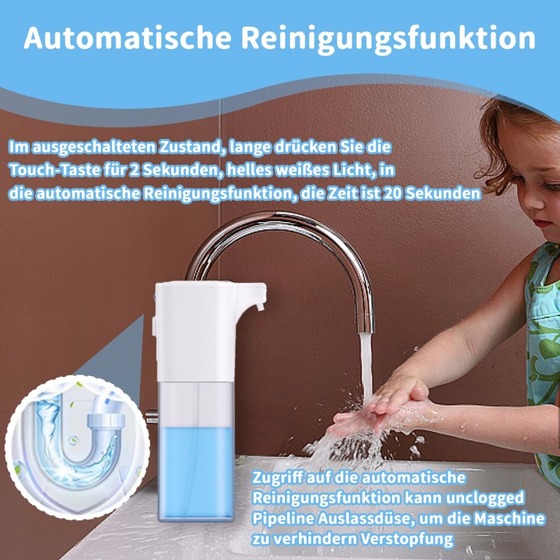 • Automatic cleaning: Unlike conventional automatic soap dispensers, our soap dispenser has a self-cleaning function. The self-cleaning function frees the pipe nozzles from blockages and prevents the device from clogging and difficult to clean. The automatic soap dispenser can be mounted on the counter or wall. It comes with a self-adhesive wall plate that saves space as there is no need to drill holes during installation.