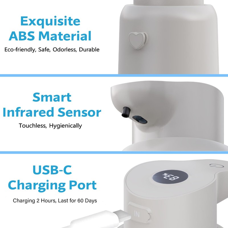 - 【USB Recharge & Durable Foam Soap Dispenser】Equipped with a 1200mAh robust built-in rechargeable battery, enabling the dispenser to run for up to 100+ days on a single charge. Unlike battery-powered counterparts, it curbs battery consumption and eliminates the need for constant battery changes