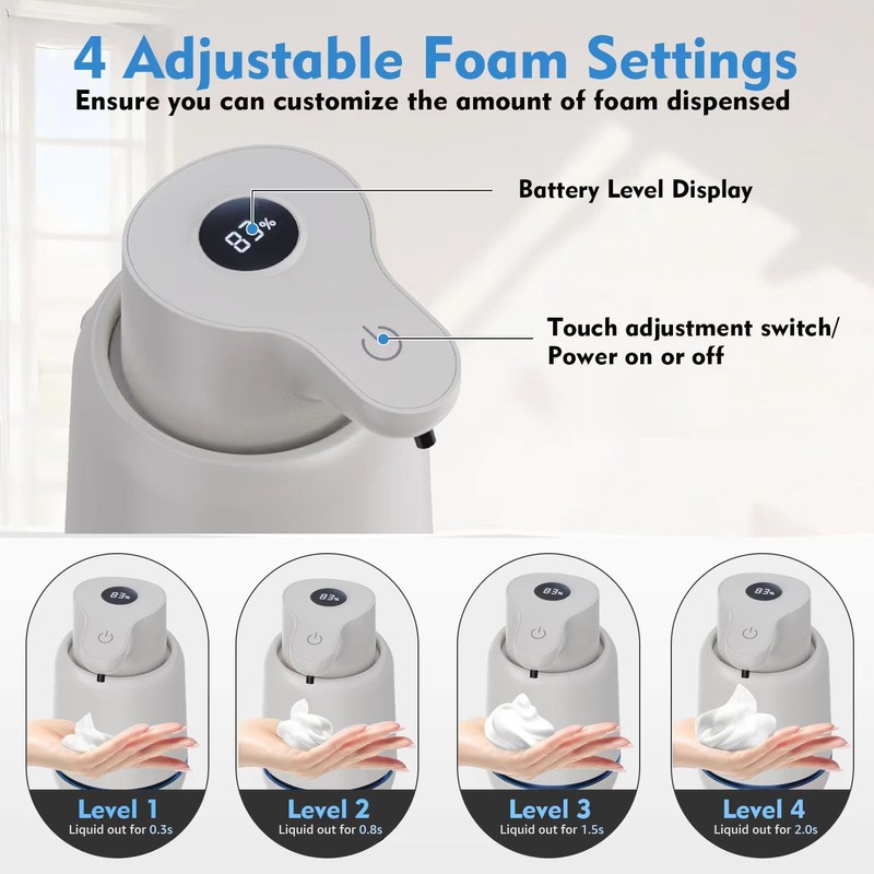 - 【Touchless & 4-Level Adjustable Automatic Foam Soap Dispenser】 Say Goodbye To Traditional Soap Dispensers! Featuring upgraded smart infrared sensing, our intelligent foam soap dispenser dispenses foam soap in 0.25 seconds. It offers a touch-free handwashing experience for enhanced health and safety. Customize foam output via 4 adjustable settings. Press the power button to switch between 0.3s, 0.8s, 1.5s, or 2s modes. With its touchless design, our soap dispenser is particularly attractive to children