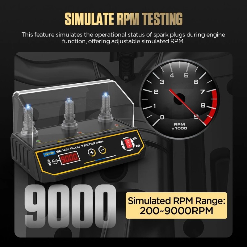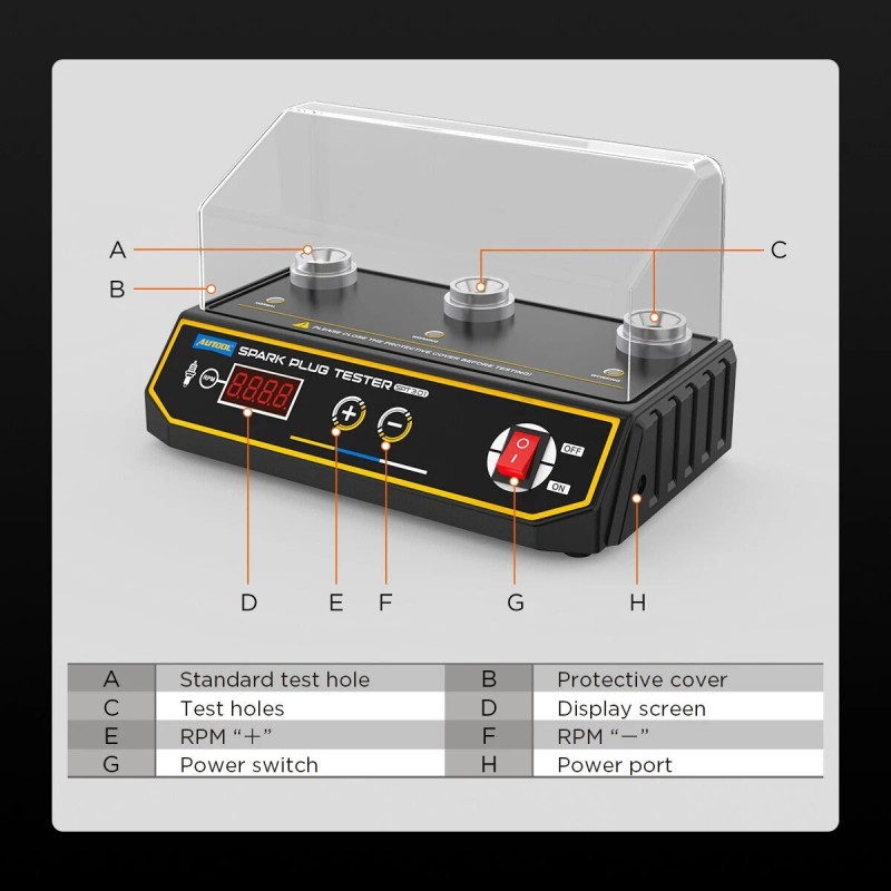 | Simulated RPM Test This function simulates the operation of the spark plug during engine operation, providing an adjustable simulated RPM. The operating frequency is in the range of 200~9000rpm | Safety cover Before performing the test, the user can simply close the protective cover to effectively prevent sparks from harming the individual, giving the user more peace of mind during the testing process. | Three-hole design With the ability to test three spark plugs simultaneously and a test diameter of 12mm, it can be used to test 12V automotive spark plugs and is widely compatible with 99% of crankshaft engine and motorcycle spark plugs on the market. |