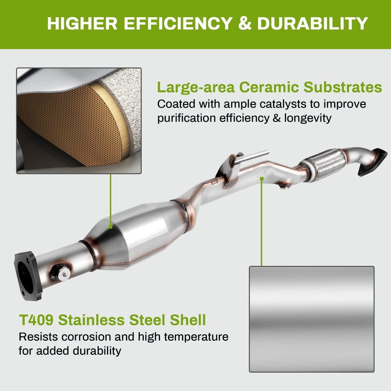 - HIGHER EFFICIENCY & QUALITY: Internal ceramic substrates contain ample metal catalysts and offer a larger surface area to fully react; Adopts heavy-duty T409 stainless steel shell that highly resists heat, rust, and corrosion for longer service life, no worry about bending or melting.