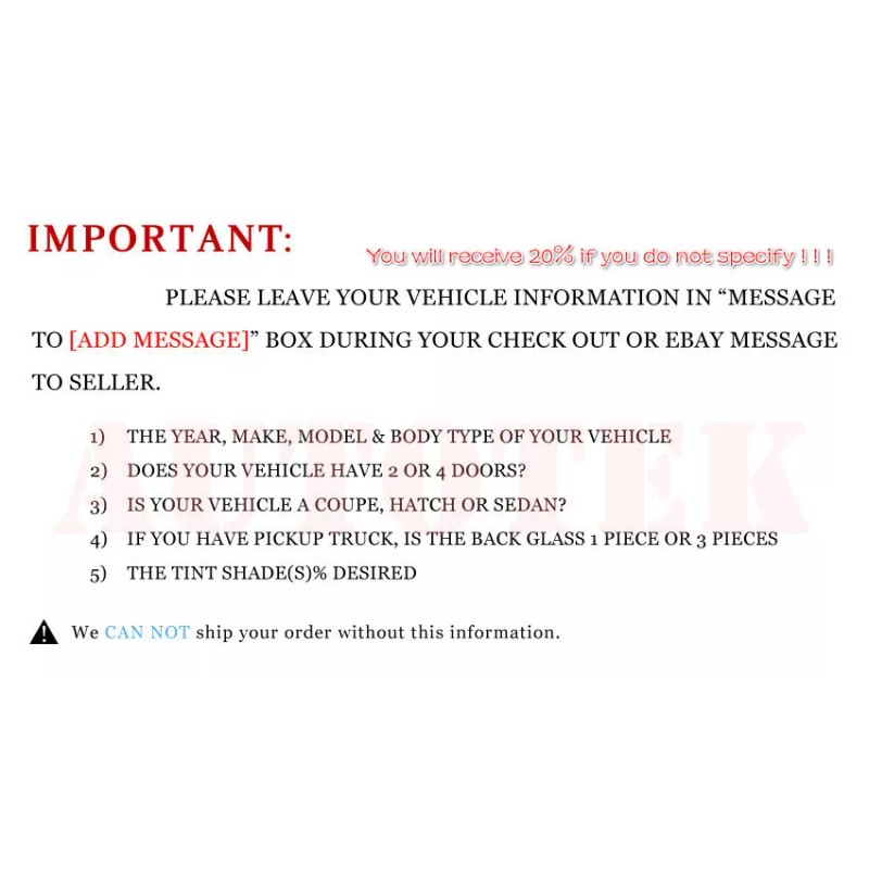 A: Please leave us a note with the Year, Make, Model, Body Type and Shade % during checkout. We cannot ship your order without the required information.