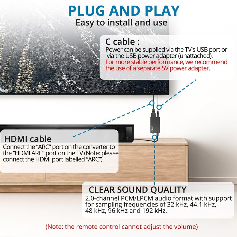- Connection and setting: the installation process consists of three steps: ① Connect the converter to the HDMI port labeled "ARC" on the TV. ② Activate the CEC function in the TV's setup menu (names may vary depending on brand, e.g. Anynet+, SimpLink). ③ Set the TV audio output to "HDMI ARC" and select 'PCM' or "LPCM" for the audio format (or digital sound output). Following these steps will help with normal use