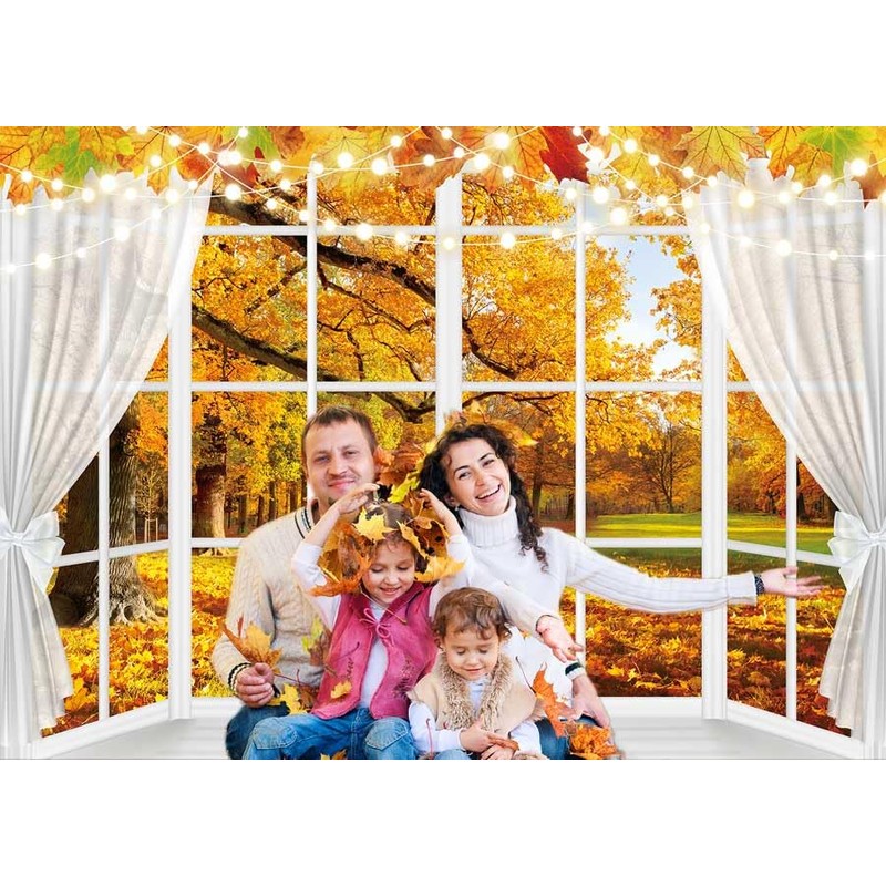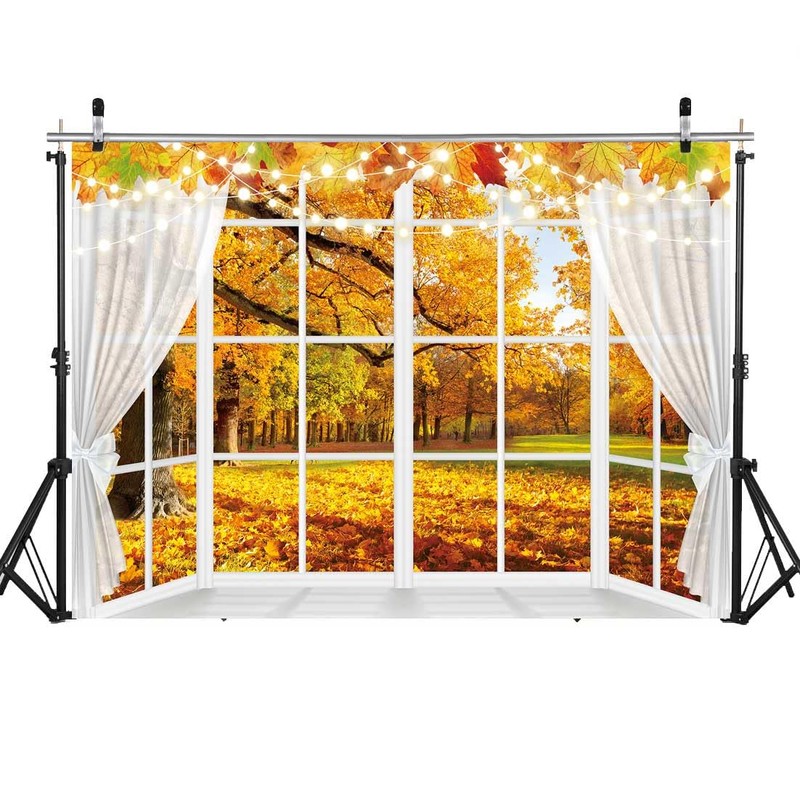 Autumn Window Photography Backdrop 7x5FT White Curtains Fall Forest Scene Background Autumn Thanksgiving Party Decorations Supplies Photo Props
