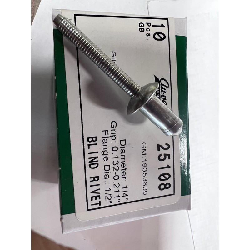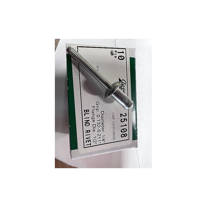 PRODUCT DETAILS: Quantity: 10 Finish: Zinc Flange Diameter: 1/2 in. Grip Range: 0.132 in. Material: Steel Rivet Diameter: 1/4 in. Made In: Great Britain OEM CROSS REFERENCES: Fits Buick: 19353809 GM: 19353809 Lawson: 1632898 VEHICLE FITMENT INFORMATION: Fits Buick Encore GX: 2020, 2021, 2022, 2023 Cadillac CT6: 2016, 2017, 2018, 2019, 2020 Fits Chevrolet Equinox: 2018, 2019, 2020, 2021, 2022, 2023