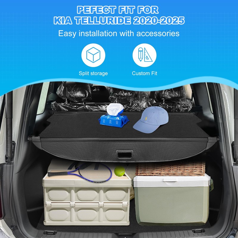 - 🚗 Enhanced Functionality: Designed for the 2025 2024 2023 2022 2021 2020 Kia Telluride, this cargo cover effectively shields private items from harmful UV rays. By concealing your valuable belongings under the cover, it enhances security and peace of mind. The cover also divides the trunk area into two functional sections, allowing you to store handy items on the upper layer. This smart design helps you utilize trunk space efficiently, keeping it tidy and organized.