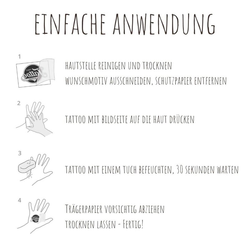 Cut out your desired motif, peel off the backing paper and press the tattoo on the desired body area with the image side down on the skin. Now moisten the tattoo with a cloth or sponge, wait 30 seconds and carefully peel off the backing paper. Et voilà - now your new tattoo can be admired. Let it dry completely.