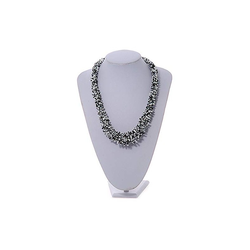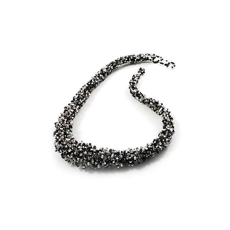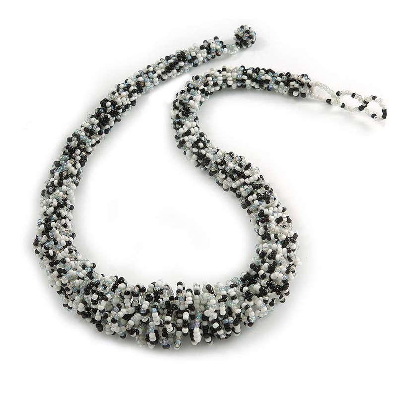 Deck your outfit with a wealth of this Black & White Chunky Glass Bead Necklace. The necklace has a graduated chunky design, made of glass beads in hues of black, white and transparent set in random order for a natural style. The necklace measures about 60cm in length and secures with an adjustable button and loop clasp for a reliable fit.