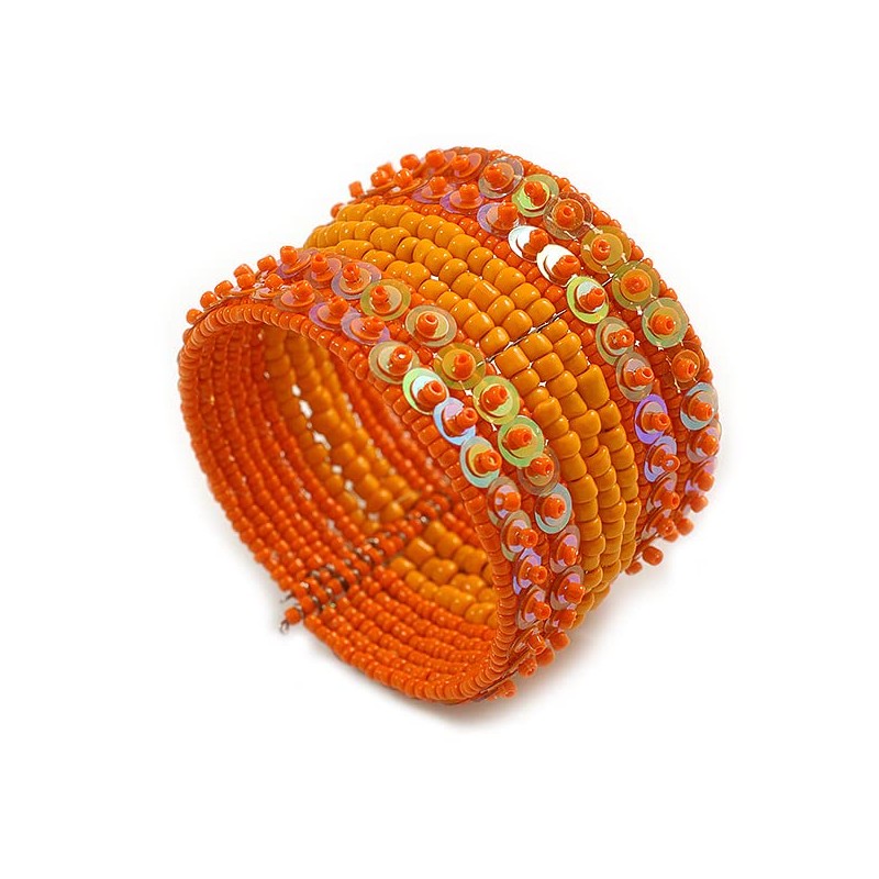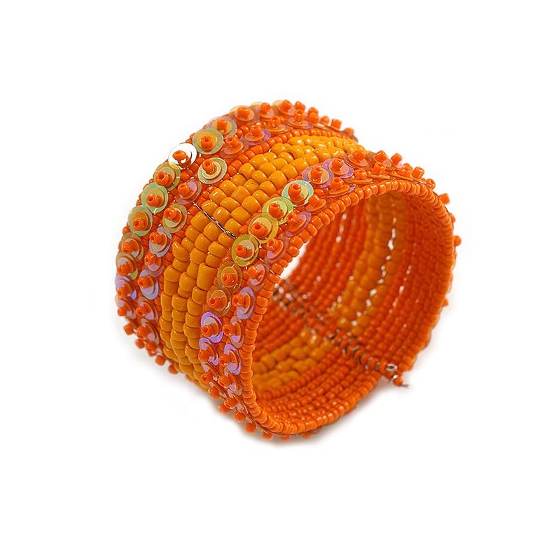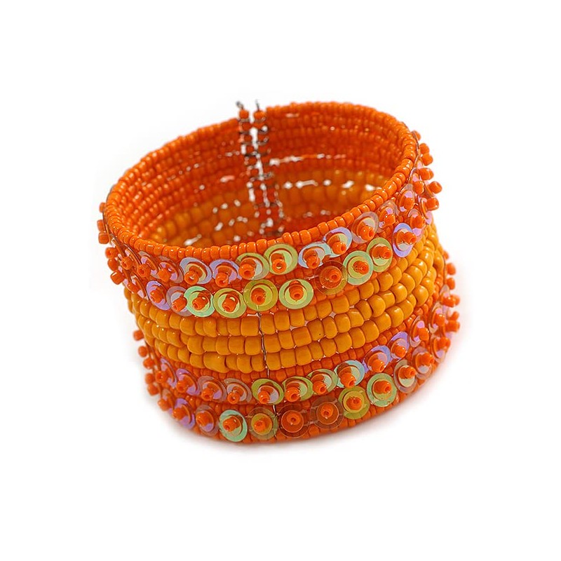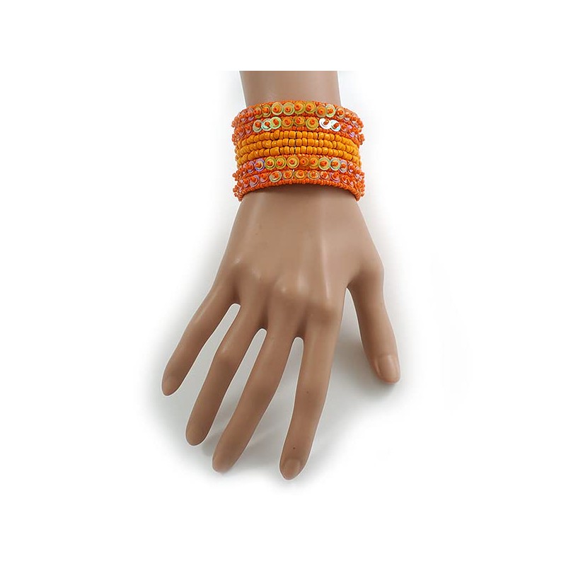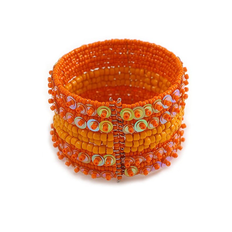 Avalaya Bohemian Wide Beaded Cuff Bangle with Sequin (Pumpkin Orange) - Adjustable