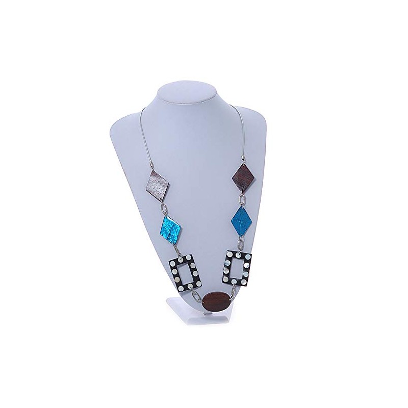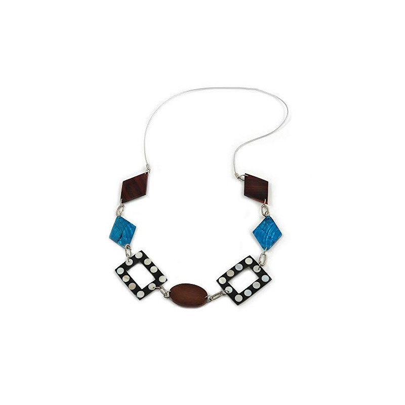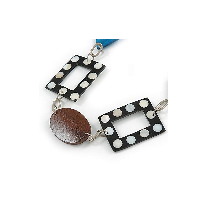 Avalaya Brown/Teal Wood and Shell Bead Silver Rubber Cord Necklace/Geometric Style/80cm Long