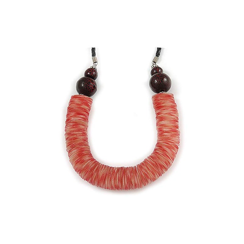 Add a chic touch to any outfit with this Chunky Rose Red Shell Coin Necklace with Black Faux Leather Cord. The necklace made of rose red coin shape shell peaces and decorated with a black faux leather cord. The necklace measures about: 55cm Long. Fastens with a silver tone lobster claw clasp.