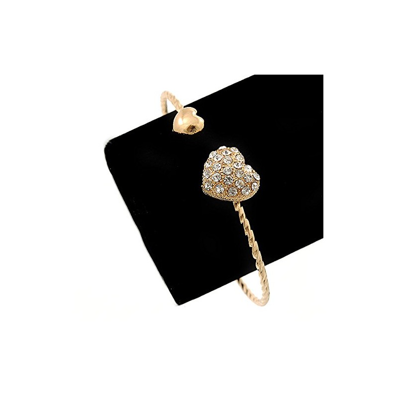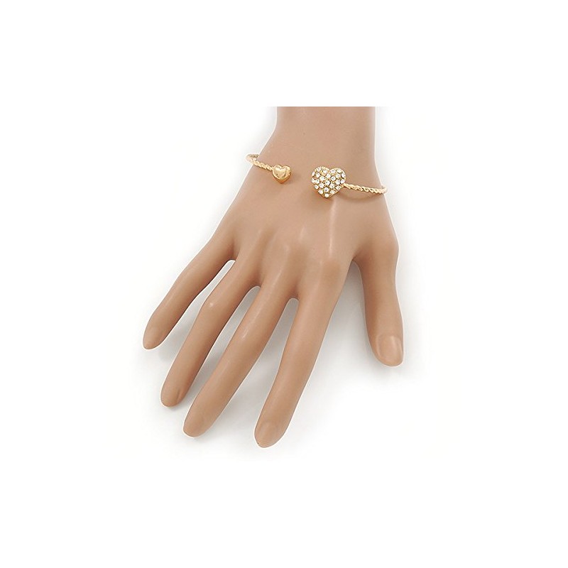Light up your look with this 'Double Heart' Crystal, Twisted, Gold Plated Cuff Bracelet. Featuring a slim, twisted cuff bangle design, crafted in gold plated metal and decorated with two hearts, placed at each end. The bigger heart: 15mm x 15mm, garnished with clear crystals for a dash of sparkle. The bangle measures about 65mm in diameter, can be slightly adjusted.