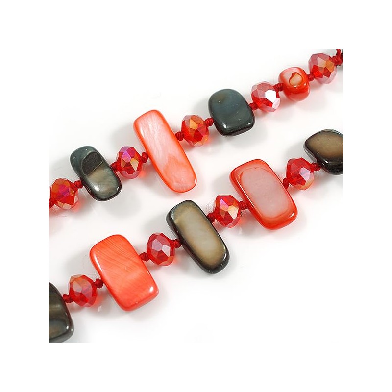 Avalaya Long Red/Black Shell Nugget and Red Faceted Glass Bead Necklace - 112cm Long