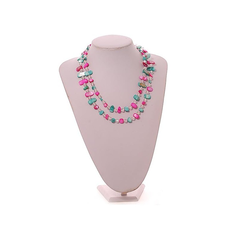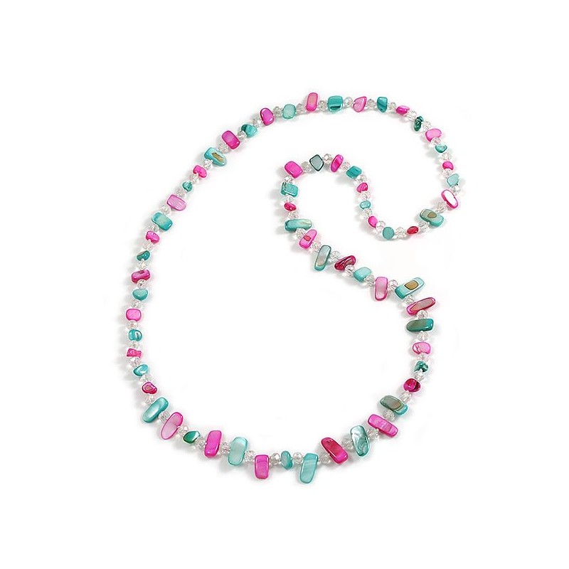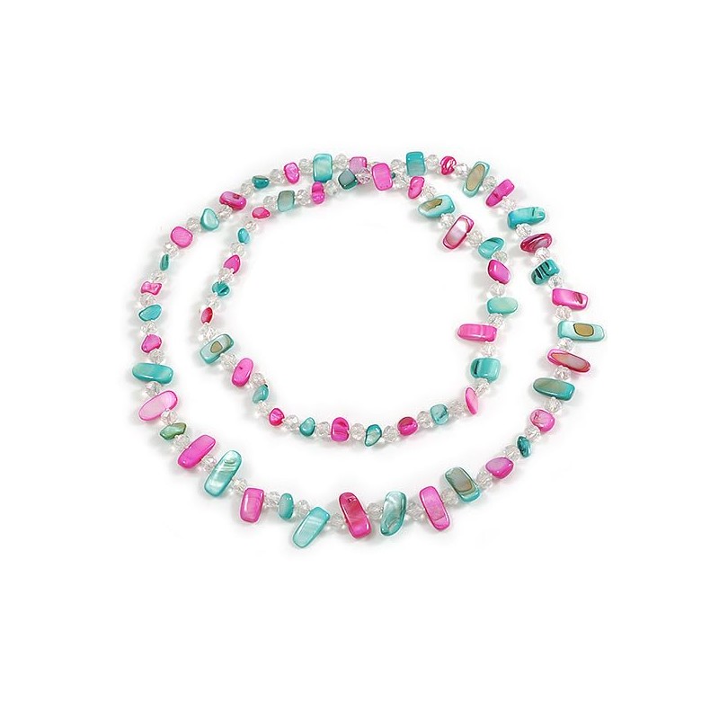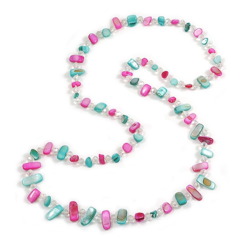 Avalaya Long Shell Nugget and Clear Faceted Glass Bead Necklace in Mint Green/Fuchsia Pink - 106cm Long