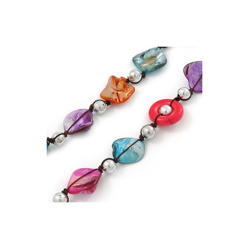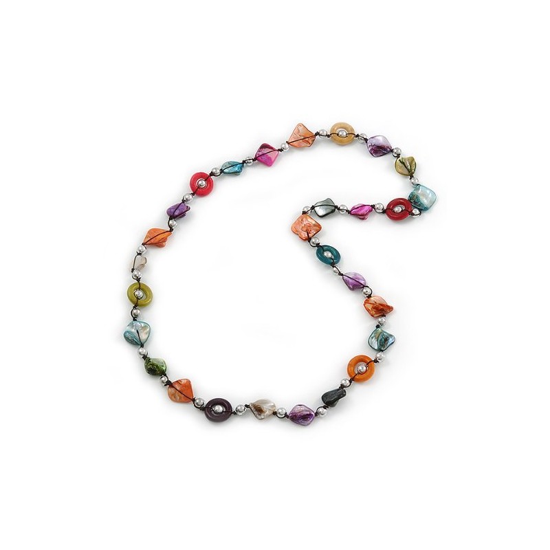 A refreshing way to diversify your fashion jewellery collection! This long necklace features an alternated beaded design. It's made of multicoloured shell nuggets and round wooden beads, all set on the black silk thread and separated with silver tone acrylic beads. The necklace approx. 90cm long and an easy-to-wear, no fastening so can be slipped over the head. A great way to add some femininity to any outfit!