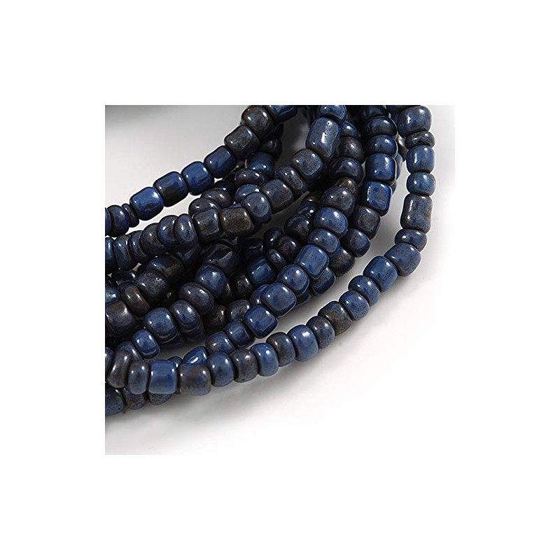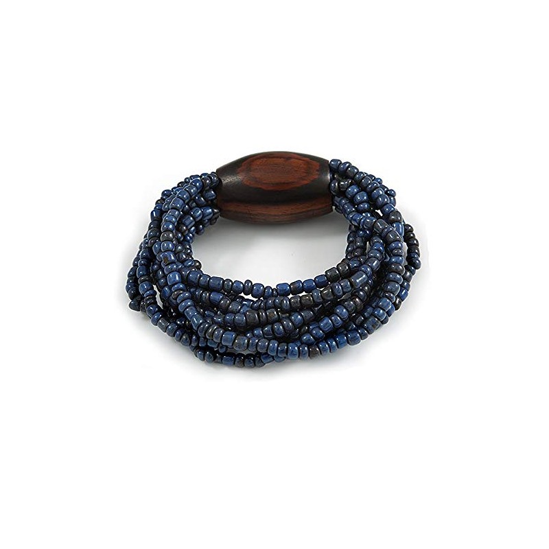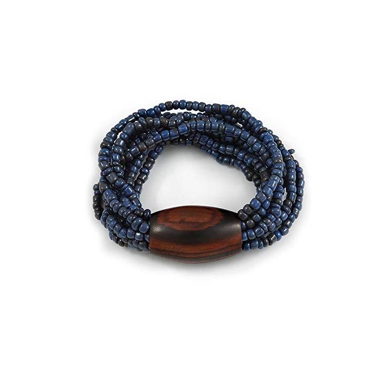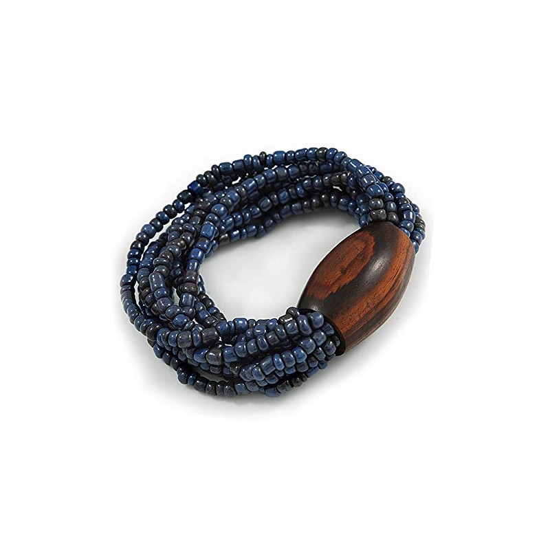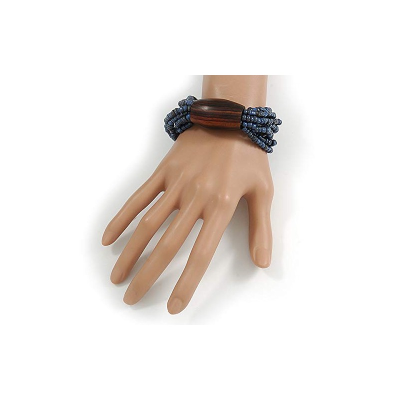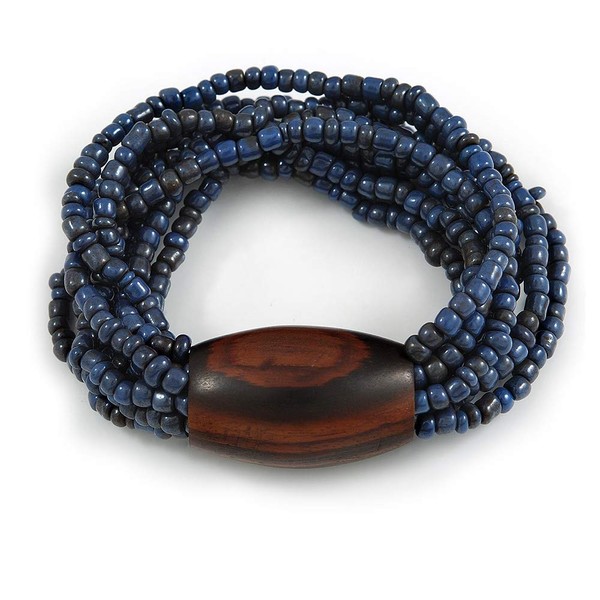 Avalaya Multistrand Denim Blue Glass Bead with Brown Wooden Bead Flex Bracelet - Medium