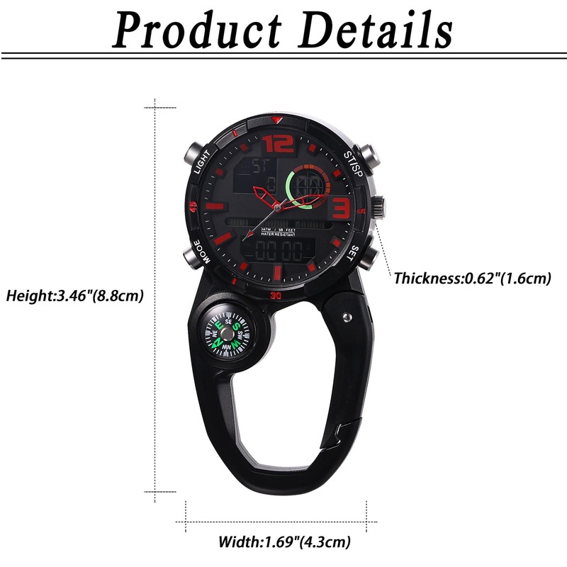 - Use: If you want to go on holiday, you can hang this carabiner watch on your backpack, trousers, etc. Very portable and practical.