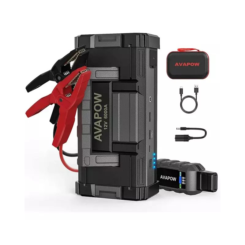 The AVAPOW Car Jump Starter packs an impressive 6000A peak current and a 32000mAh high-capacity battery, ideal for starting gas and diesel engines. It works with all 12-volt vehicles, from cars to boats, RVs, and more.With its ultra-light, portable design and smart jumper clip with eight-fold security protection, safety and convenience are paramount. The built-in indicator light prevents accidents caused by wrong operation.But that's not all! It's also a powerful car power pack, boasting two USB ports, including quick-charging, for your electronic devices during emergencies or outdoor activities.Jump Box features three LED modes - Illuminated, Flashing and SOS - combining safety, portability and versatility into one comprehensive and professional vehicle starting solution.Upgrade now and never be stranded again!