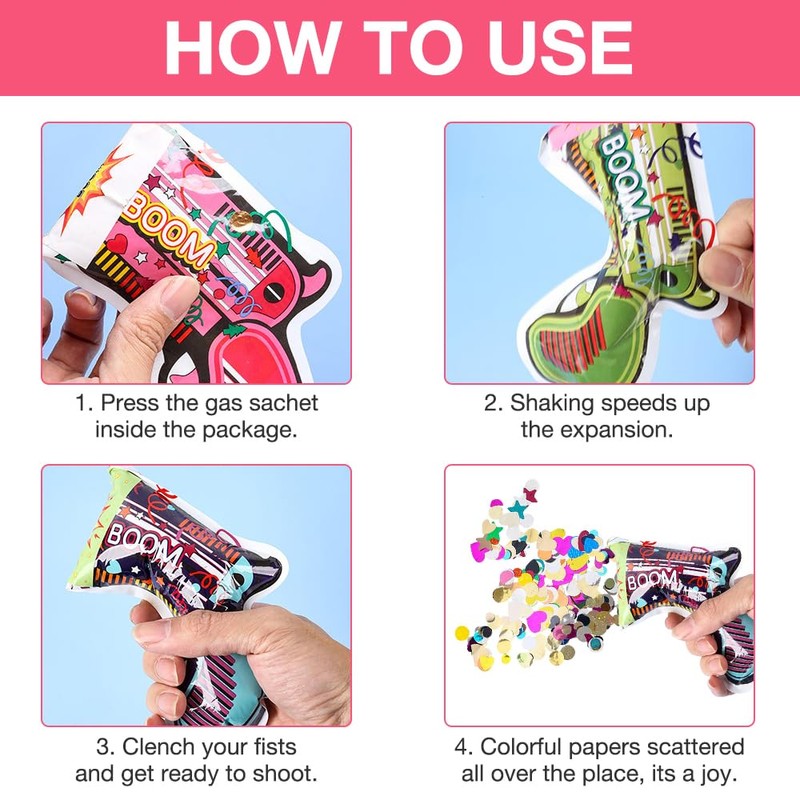 - Easy to use: first, the air was blown into the confetti gun and then forcefully pushed forward, and after a loud bang, colourful confetti flew out. Low impact, safe and harmless, confetti gun is suitable for playing with children or pets