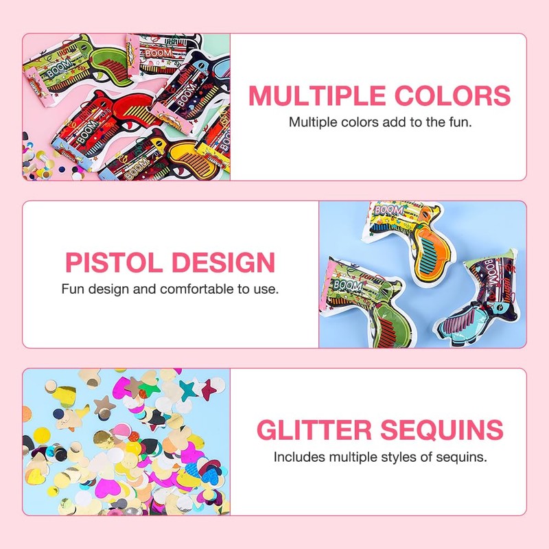 - Confetti gun set: the confetti gun has 50 confetti cannons. Large quantity, confetti bomb suitable for sharing with friends. Our confetti gun is made of coloured love hearts, circles, stars and sequins, which are easy to clean