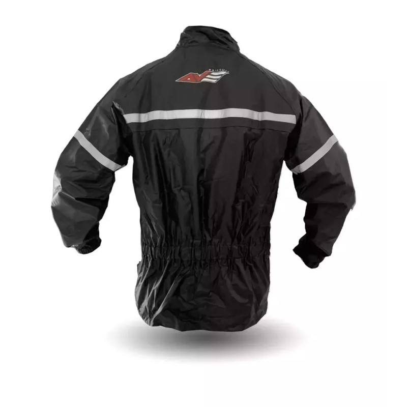 This is a two-piece set rain suit by the brand AVE designed for men. The set includes a black rain coat in size M and matching pants, both made of nylon with a polyester lining. The style of the outfit is described as a rain coat, ideal for keeping dry in wet weather conditions. This set is perfect for outdoor activities or work that requires protection from the rain.
