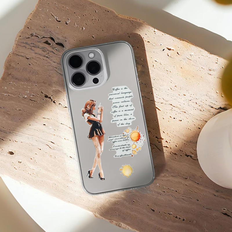 - The coffee themed tape set includes 2 PET tapes and 2 washi tapes featuring cozy brown tones and beautiful images of coffee shops, coffee makers, coffee machines and beans, flowers, and assorted coffee girls.