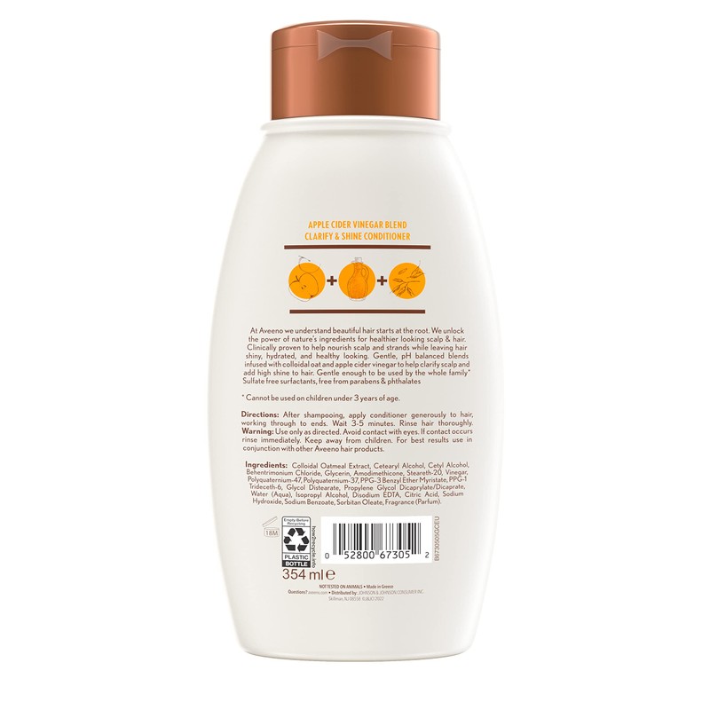 Clarify and nourish your hair with Aveeno Apple Cider Vinegar Conditioner. This nourishing conditioner helps promote a healthy scalp while cleansing and reinforcing shine. Great for oily, dull hair, the apple cider vinegar formula leaves hair feeling healthy, clean and shiny. Part of the Aveeno Scalp Soothing Haircare Collection, this conditioner contains oat as the first ingredient, which is known for its soothing and moisturizing properties. All Aveeno hair care products are made with balanced blends of wholesome ingredients and are free from sulfates, parabens and dyes. Aveeno is known for bringing the soothing and healing properties of nature to skin care and now offers nourishing care for your scalp and hair. Were not only mindful of what goes into our formulations, but also of our impact on the world around us. To use: After shampooing, apply conditioner generously to hair, working through to ends. Wait 3 5 minutes, and then rinse hair thoroughly. Start with Apple Cider Vinegar Shampoo for the optimal clarifying routine.