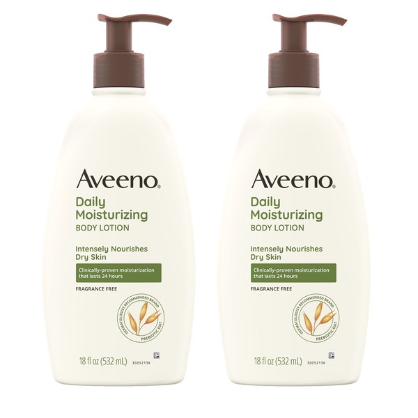 Amazon.comThe #1 body lotion used in the US, AVEENO Active Naturals Daily Moisturizing Lotion with Natural Colloidal Oatmeal helps prevent dry skin with this naturally nourishing lotion. It contains a natural colloidal oatmeal blended with rich emollients and, with regular use, is now proven to help skin build a "moisture reserve," so skin can replenish itself.AVEENO Daily Moisturizing LotionActive Naturals Daily Moisturizing LotionAt a Glance: Clinically proven to relieve dry skinClinically shown to moisturize for 24 hoursFragrance freeNoncomedogenicGentle enough for everyday useGood for sensitive skinNon-greasyAVEENO Daily Moisturizing Lotion helps your skin build a "moisture reserve," so it can replenish itself. Dermatologist RecommendedAVEENO Active Naturals Daily Moisturizing Lotion is shown to help skin build a "moisture reserve," so skin can replenish itself. When used daily, its fast-absorbing formula with ACTIVE NATURALS oatmeal helps prevent and protect dry skin, leaving it feeling soft, smooth and naturally healthy looking.Natural Colloidal OatmealThe natural colloidal oatmeal found in AVEENO helps to leave a protective barrier, which prevents water loss to help maintain moisture all day long. The AVEENO oatmeal formulas are also known to soothe and moisturize itchy, extra dry skin.Oats have a long history of being valued for skin care dating back to the ancient Greeks and Romans who used oat baths to heal skin ailments. AVEENO scientists developed innovative formulations, using finely milled (colloidal) oatmeal, that retain the naturally active benefits of the oats.The Science Behind OatsThe scientists at AVEENO discovered a technological advancement that facilitated the fine milling of oatmeal, known as colloidal oatmeal. The innovation of fine milling allowed the colloidal oatmeal to retain its naturally active benefits, which can help to moisturize and relieve dry skin.The Benefits of OatsRelieves dry skinThe natural colloidal oatmeal lotion formulas of AVEENO moisturize and help protect skin.Soothes itchy, irritated skinColloidal oatmeal provides temporary skin protection and, when used in a bath treatment, can relieve minor itching and irritation due to rashes, eczema, poison ivy/oak/sumac, and insect bites.Soothes extra dry, irritated skinColloidal oatmeal combined with menthol, shea butter, and other skin protectants has been clinically proven to relieve itchy, extra dry, and cracked skin.Moisturizes skinOat proteins leave a protective barrier on the skin, which prevents water loss to help maintain moisture.AVEENORecommended by dermatologists for over 60 years, AVEENO combines the best of nature and science to reveal the natural beauty of your skin. AVEENO uses select natural ingredients because of their advanced benefits--they call these ACTIVE NATURALS, natural ingredients uniquely formulated to deliver visible results.What's in the BoxAVEENO Active Naturals Daily Moisturizing Lotion, 18-Ounce Pump (Pack of 2).Body Wash Eczema CreamDaily Moisturizing Body WashFragrance Free Skin Relief Body WashEczema Therapy Moisturizing CreamLotionDaily Moisturizing LotionDaily Moisturizing Lotion with SPF 15Skin Relief Moisturizing LotionProduct DescriptionAveeno Daily Moisturizing Body Lotion with Prebiotic Oat formula intensely nourishes dry skin. Formulated with soothing prebiotic oat, the fragrance-free lotion has clinically proven moisturization that lasts 24 hours. This moisturizing daily body lotion nourishes and helps replenish skin's natural moisture barrier. The unique prebiotic oat formula absorbs quickly and nourishes dry skin with moisture, leaving your skin soft, beautiful and healthy-looking. Aveeno Daily Moisturizing Lotion's gentle formula does not contain fragrances, parabens, or dyes. From the dermatologist-recommended brand, this nourishing lotion for dry skin has been allergy tested and non-greasy, non-comedogenic, and gentle enough for daily use as part of a regular skincare and beauty routine. To use, apply daily as often as needed.