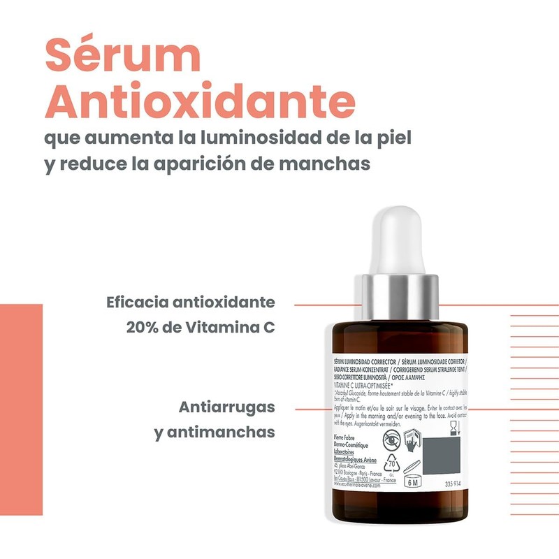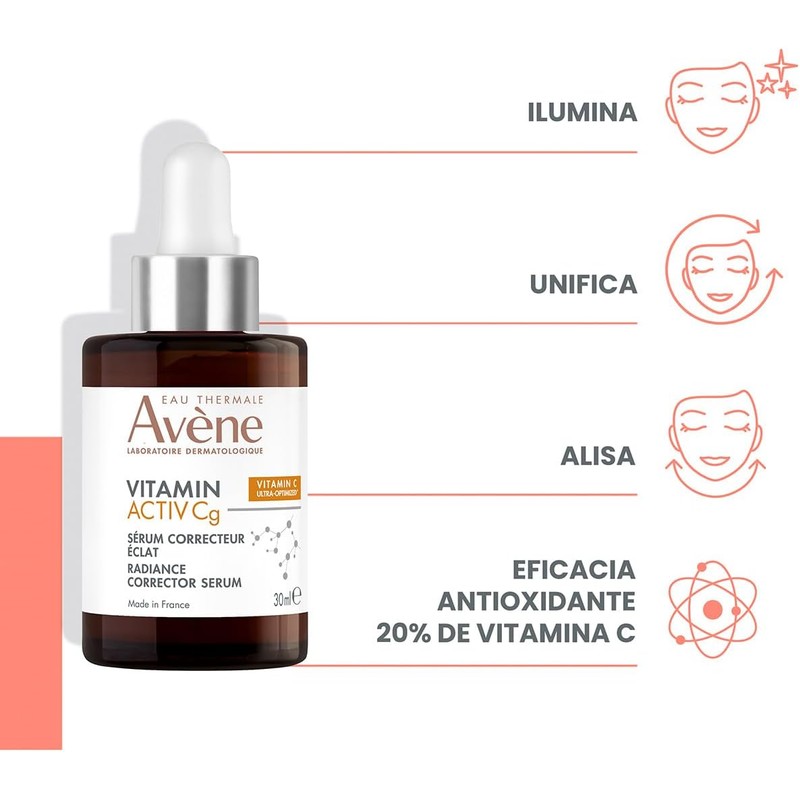 Vitamin Activ Cg Sérum dermatólogico antioxidante que brinda un triple beneficio: antiarrugas, antimanchas y luminosidad. Piel más lisa y con tono más uniforme. Contiene Vitamina Cg 1.8%, una forma estable de Vitamina C con propiedades antioxidantes y estimulantes de la síntesis de colágeno en la piel; niacinamida 3% también conocida como Vitamina B3, con eficacia antioxidante y antiinflamatoria; Bakuchiol 1.5%, una alternativa de origen vegetal al retinol, porque actúa funcionalmente como un equivalente de este último, poderoso efecto antioxidante que corrige arrugas y líneas finas; y agua termal de Avène, con propiedades calmantes y reparadoras.