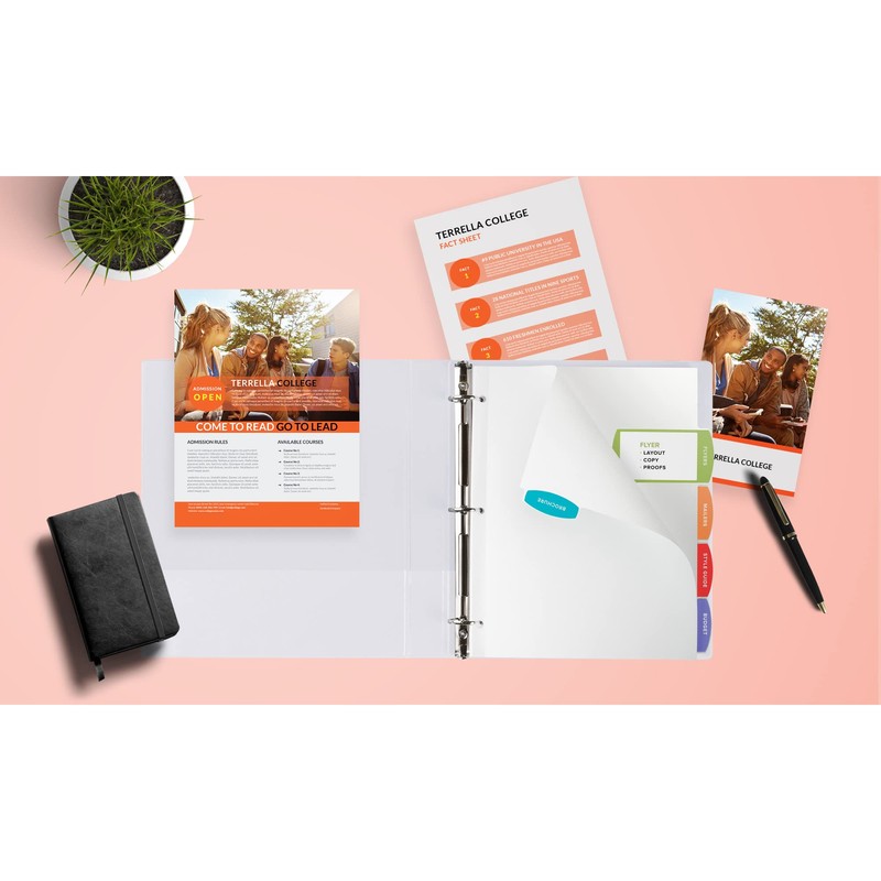 • Large labels extend from tabs onto divider bodies for more information section contents logos or designs