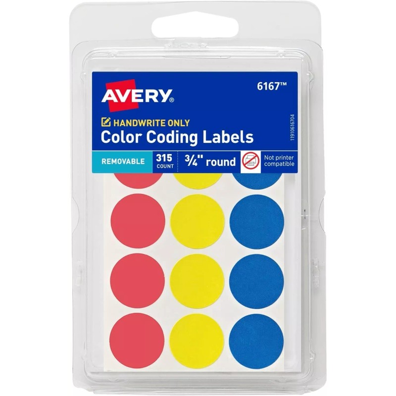 - Item includes 315 3/4" round labels in assorted colors (blue, red and yellow), perfect for color-coding, price labels, bullet journal stickers, bin labels and more