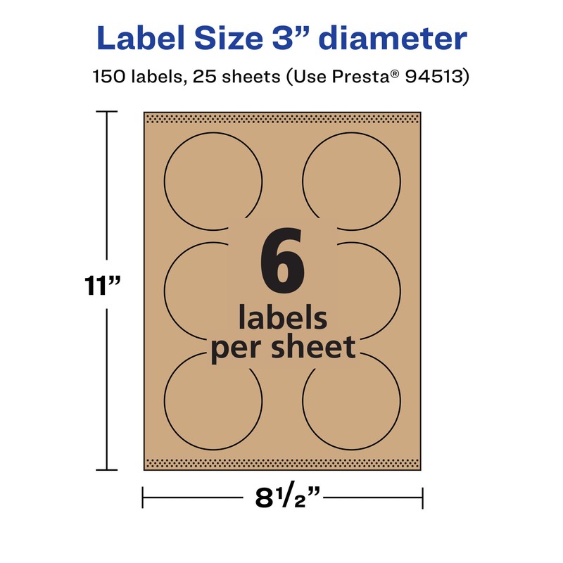 Avery Kraft Brown Round Labels with Sure Feed, 3" diameter, 150 Kraft Brown Labels, Print-to-The-Edge, Laser/Inkjet Printable Labels