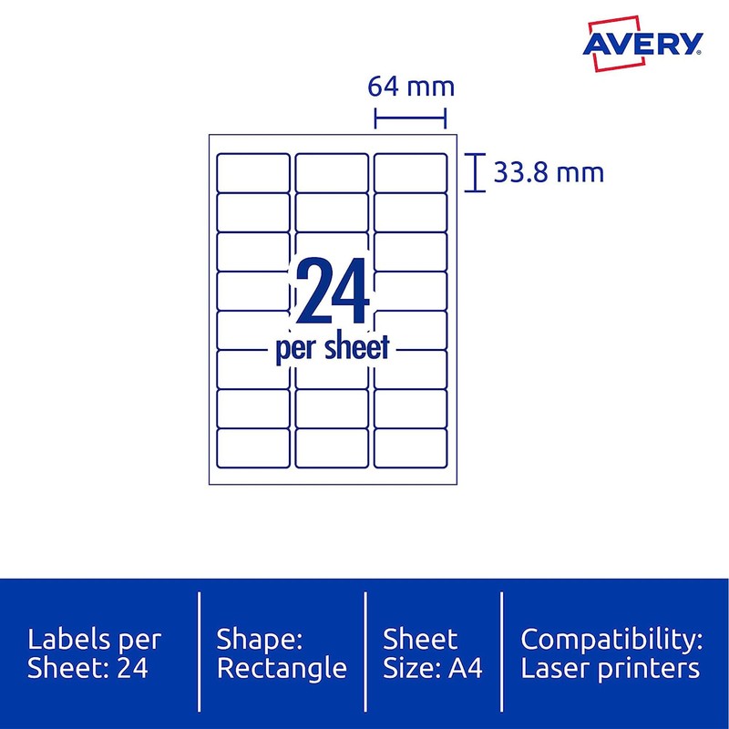 Avery Quick Peel A4 Labels for Laser Printers - Printable Packaging, Shipping & Address Labels - Mailing Stickers - White, 64 x 33.8 mm, 960 Labels / 40 Sheets (959113 / L7159)