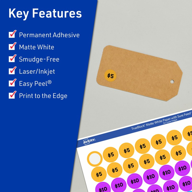 Avery TrueBlock Matte White Round Labels with Sure Feed, 1.25" Diameter, 300 Matte White Labels, Print-to-The-Edge, Laser/Inkjet Printable Labels, Great for Product Labels and Price Stickers
