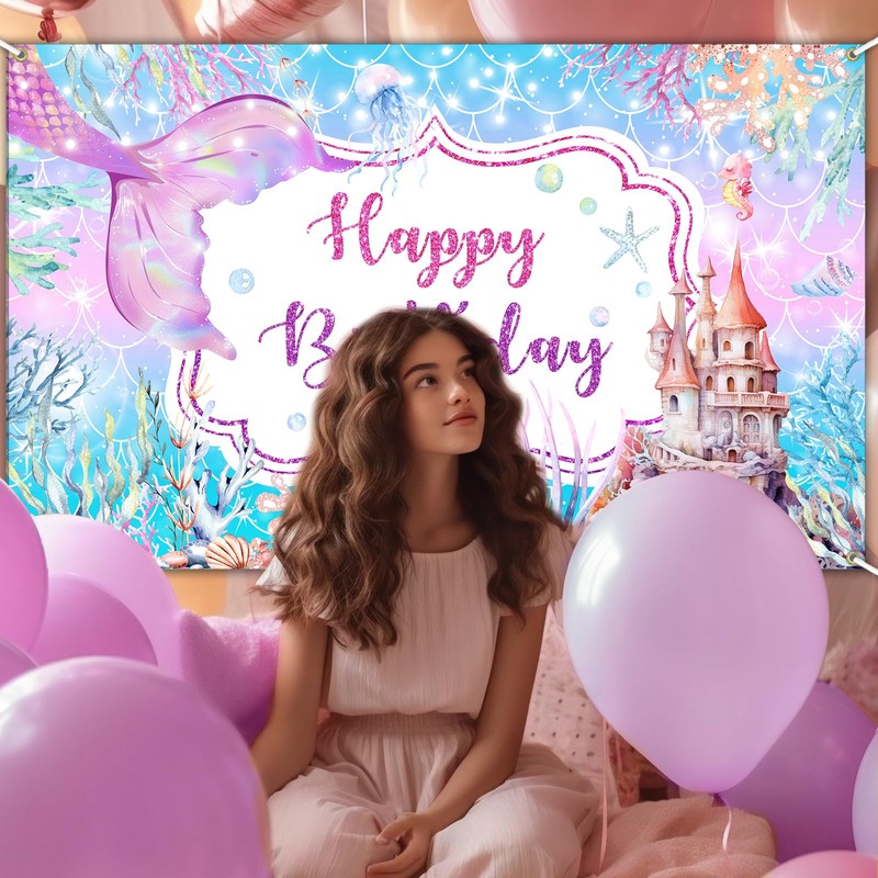 - Vibrant Mermaid Theme Design: This mermaid birthday backdrop features enchanting under-the-sea graphics with purple hues, perfect for creating a magical ocean-themed party atmosphere