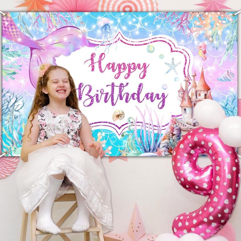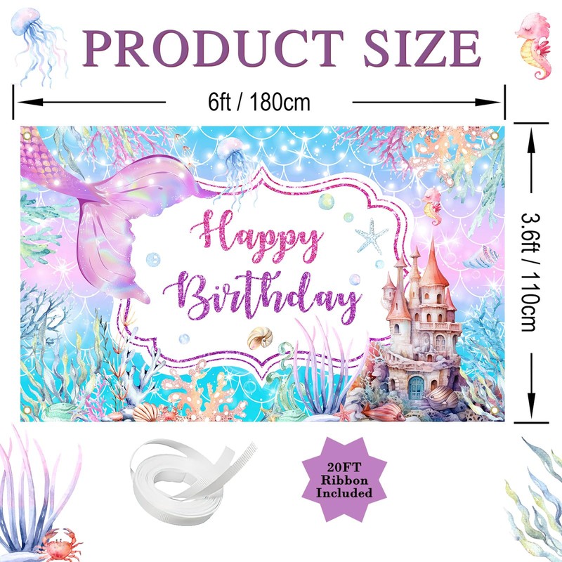 - Large Size & Easy Setup: Measuring 6x3.6ft (180x110cm), the mermaid birthday banner includes reinforced corner eyelets and a 6m rope for quick hanging on walls, tables, or outdoor spaces