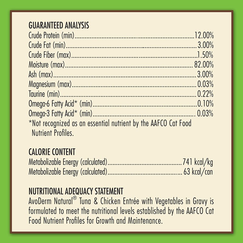 AvoDerm Tuna & Chicken Entree with Vegetables is grain free and made with high quality proteins providing healthy balanced nutrition for your cat. High quality ingredients ensure that you are providing the optimum nutrition your pet needs. AvoDerm was created for the complete health of your cat. Carefully formulated for the everyday health needs for today's cats, AvoDerm starts with premium protein sources in delicious combinations to satisfy even the finicky cat. AvoDerm has vitamins, minerals, and antioxidant nutrients to help support your cat's immune function. AvoDerm is formulated to be rich in high quality fats and oils with a balanced Omega-6 to Omega-3 fatty acid ratio. The right nutrients in the right proportions are indispensable to keeping your cat's skin healthy. Sometimes shortages or excesses of specific nutrients can lead to thin, rough coats. Avocado and avocado oil can help support the skin and coat from the inside out for the protection your pet needs. Feed AvoDerm regularly to sustain the highest level of nutrition for your cat from the inside out.