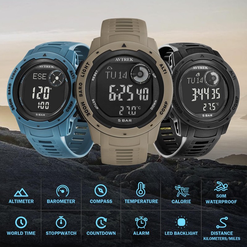 AVTREK Sport Watches for Men, 50m Water Resistant, Altimeter, Barometer, Compass, Thermometer, Pedometer, World Time, Stopwatch, Countdown, Alarm, LED Backlight, Distance in km/Miles (Black)