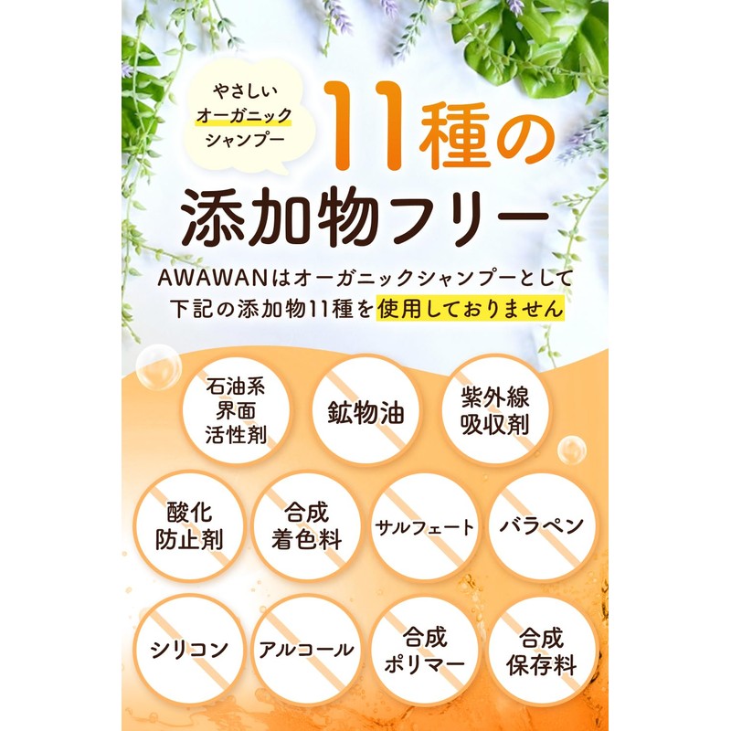 - (11 Types of Additive Free) AWAWAWAN does not use 11 types of additives as organic shampoo Petroleum Surfactant, Mineral Oil, UV Absorbent, Antioxidant, Synthetic Coloring, Salfate, Roapene, Silicone, Alcohol, Synthetic Polymer