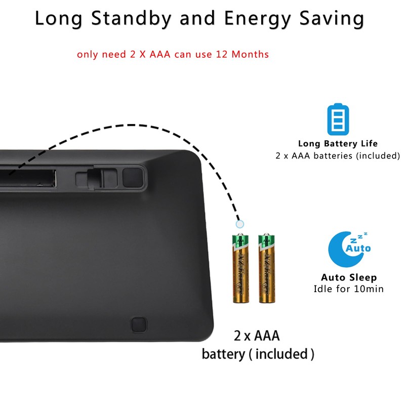 • Long-Lasting Battery: the bluetooth wireless keyboard powered by 2 AAA batteries (included), the keyboard intelligently enters sleep mode after 10 minutes of inactivity. The auto-sleep technology, on/off button(on the back of the keyboard) and the battery indicator light help to save more power,Simply click any key to wake it up in seconds.