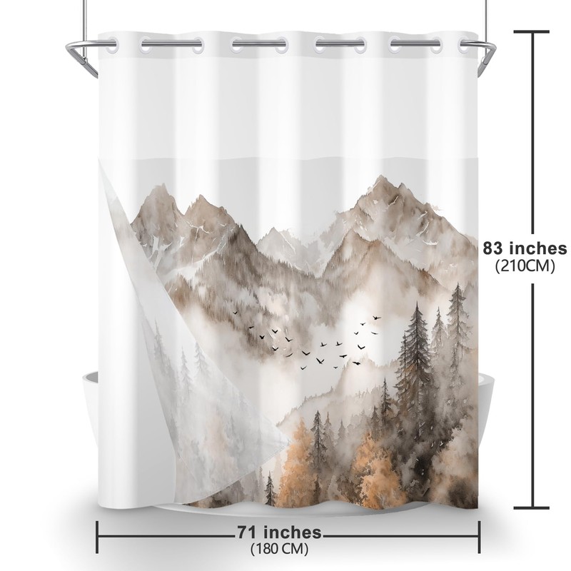 AWERT Forest Brown No Hook Shower Curtain with Snap in Liner Misty Mountain Shower Curtain for Bathroom Fabric Waterproof Inner Liner 71 Wx83L
