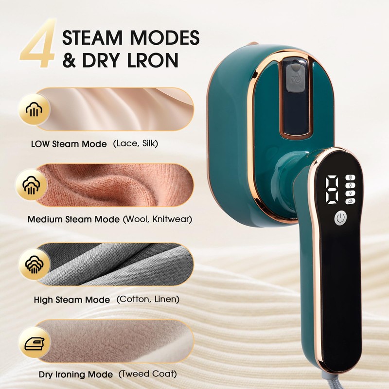 - 【LED Display & 3 Steam Modes】The Garment Steamer with led diplay, which help you know the time and steam mode. Travel Steamer Iron is suitable for various fabrics like wool, cotton, linen, silk, etc.You can adjust the steam mode based on the fabric type - low steam mode for thin and delicate materials and medium to high steam modes for thicker fabrics with stubborn wrinkles.