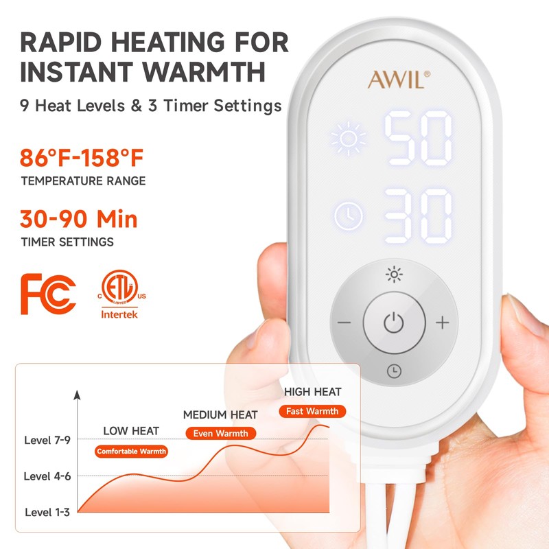 - 2. Customizable Heat and Timer Settings: Find your perfect comfort level with 9 heat settings and 3 timer options, easily adjustable using the new remote control. The pad also combines soothing heat, vibration, and gentle pressure for deep, effective relaxation.