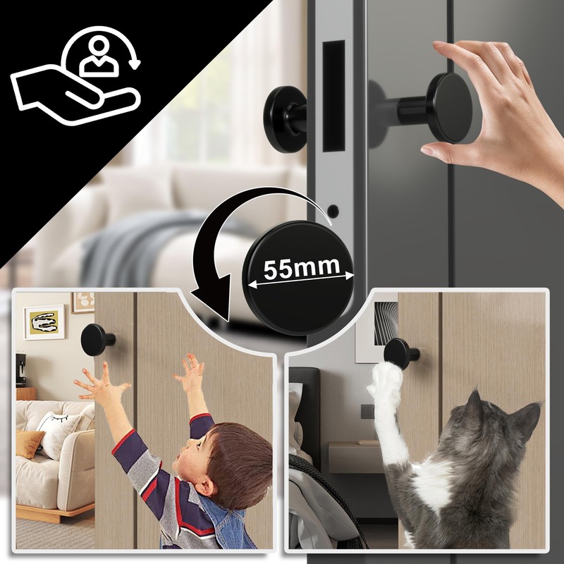 - KIDS, PETS AND SENIORS FRIENDLY - The round door knob can only be opened by rotation, so small children or pets can no longer pull up the knob and open the door. At the same time, the contact area of the door knob has been enlarged (55mm) and the distance from the door to the round knob has been increased (54mm), so that the elderly and other weaker people can open the door more easily by turning.